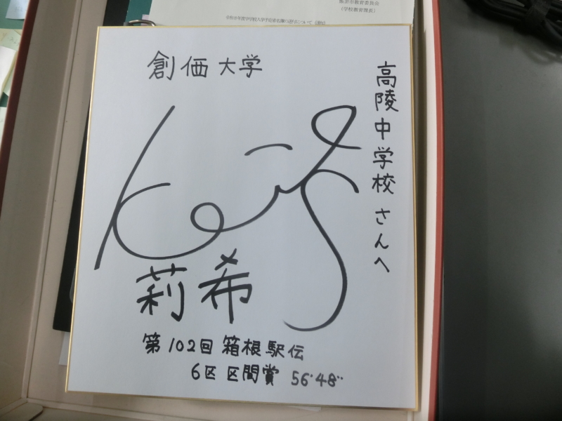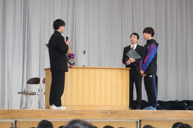 ★1月 8日(木):3学期始業式がありました。各学年の代表生徒が3学期の決意を発表しました。校長先生のお話では、サプライズゲストとして、箱根駅伝に出場し6区で区間賞を取った、高陵中学校卒業生の小池莉希選手が登場しました。小池選手から「中学、高校時代、全国大会やインターハイに出場したことはなかったけれど、継続して諦めずに続けてきたことで、花を咲かせることができた」という実体験からの思いを爽やかにお話しいただきました。先輩の話を聞いたことで、高陵中生は勇気と希望をもつことができました。